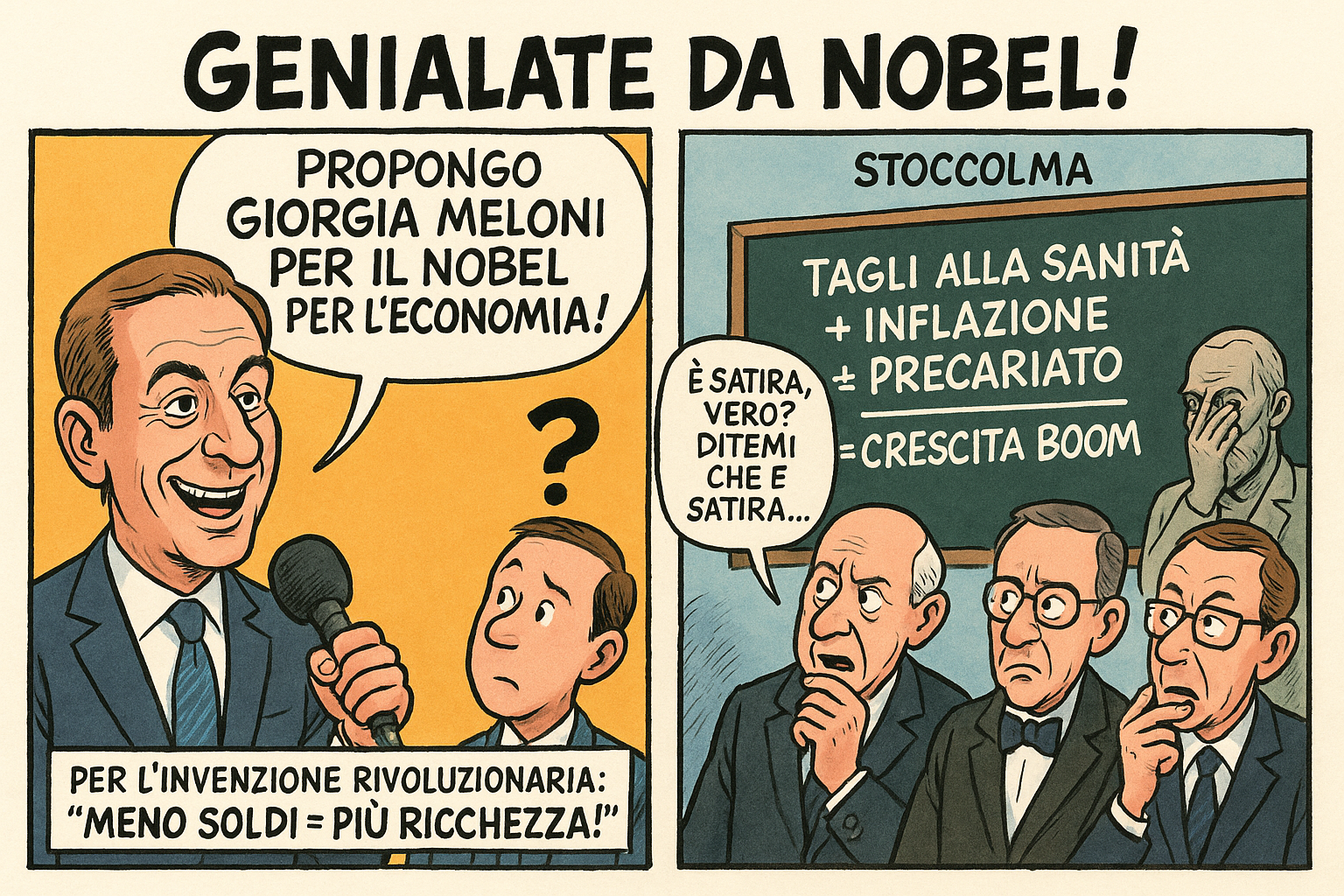 In un’Italia in cui l’arte del dire senza fare è ormai sport nazionale, la candidatura di Meloni al Nobel per l’Economia rappresenta la punta dell’iceberg di una nuova disciplina: l’economia creativa. Quella dove le cifre ballano, i conti non tornano, ma la propaganda canta.